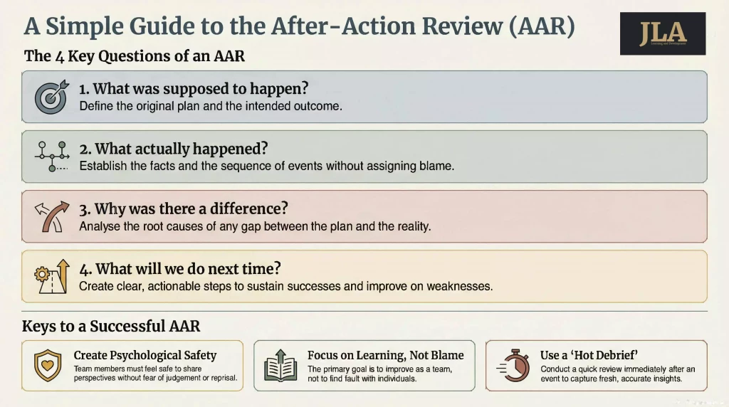 - Psychological Safety: A psychologically safe environment is paramount for effective debriefing. Team members must feel comfortable sharing perspectives and experiences without fear of judgement or reprisal. This aligns with findings that emphasise the role of psychological safety and a focus on learning in successful AAR implementation (Edmondson, 1999).